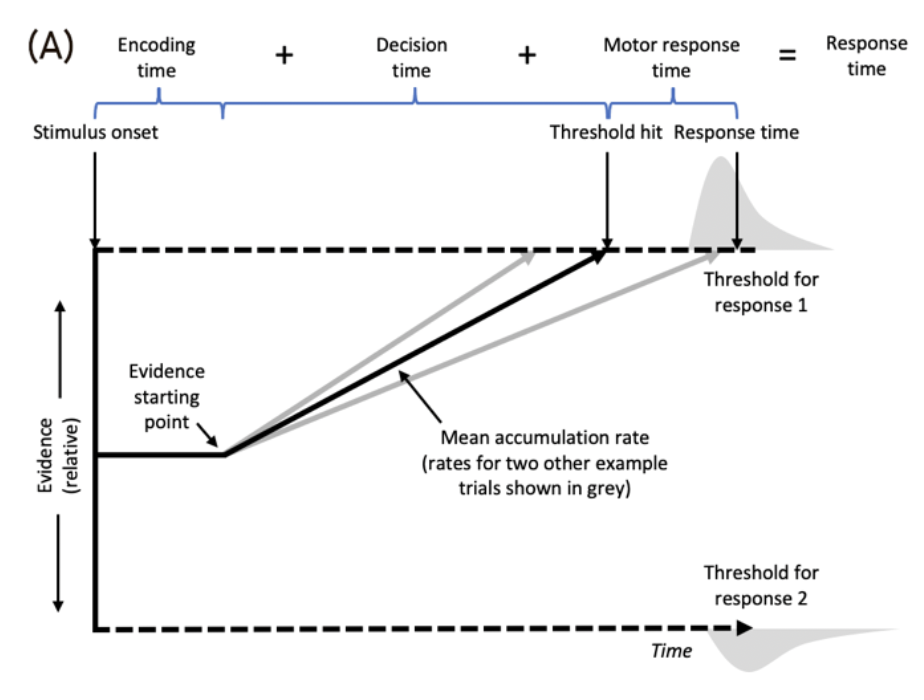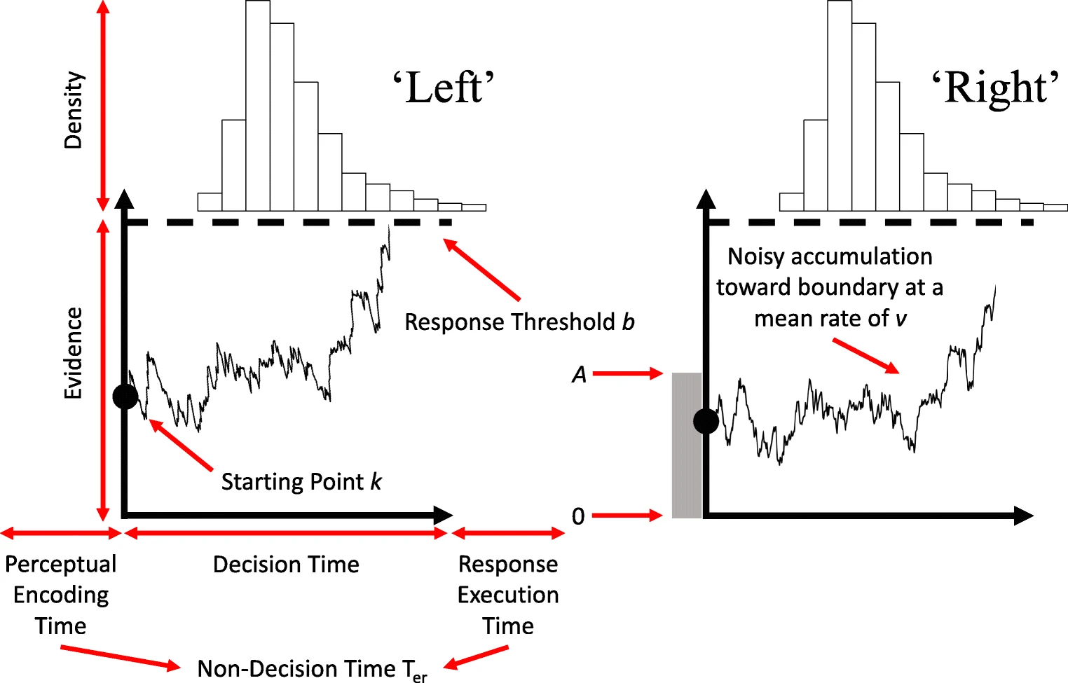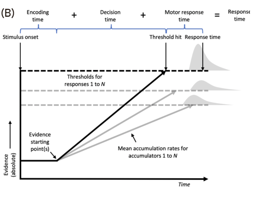 Instead of a single process choosing between boundaries, the RDM uses multiple independent diffusion processes, one per option. Each accumulator races toward its threshold. The first to cross wins. Tillman, Van Zandt, & Logan, 2020