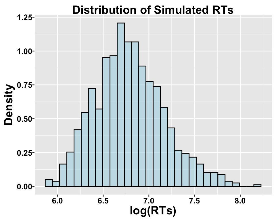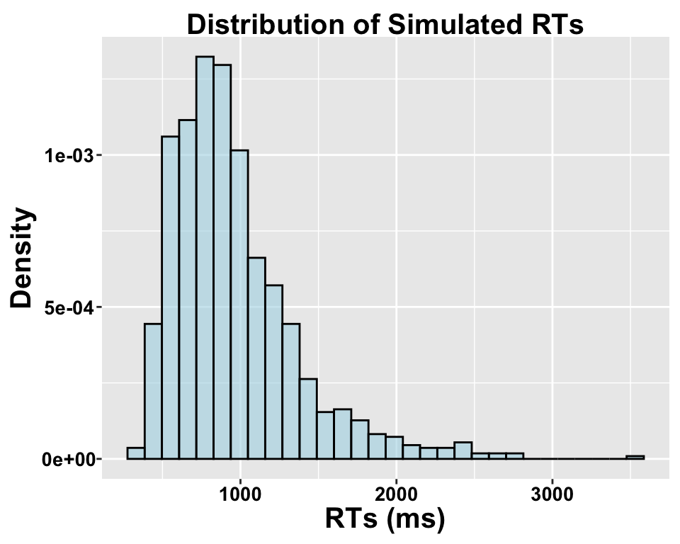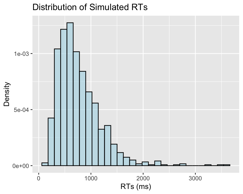 # Set seed for reproducibilityset.seed(123)# Parameters for simulationn =1000# Number of observationsa =6.5# Baseline intercept for the log-transformed mean (mu)b =0.02# Effect of covariate Xx =rnorm(n, 0, 0.05) sigma =0.5# Standard deviation of the log-transformed RTsmu = a + b*x# Effect of X on mu (mean log RT)RT =rlnorm(n, meanlog = mu, sdlog = sigma) # Log-normal dataggplot(data.frame(rt = RT), aes(x = rt)) +geom_histogram(aes(y = ..density..), bins =30, fill ="lightblue", color ="black", alpha =0.6) +labs(title ="Distribution of Simulated RTs", x ="RTs (ms)", y ="Density")