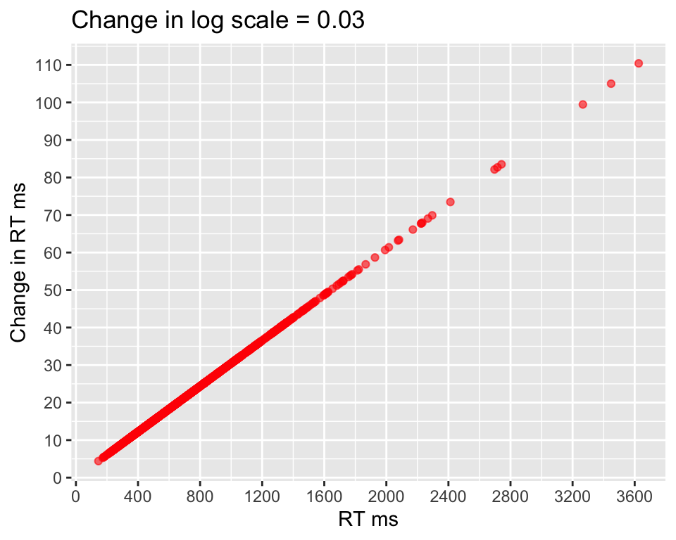 RT_diff =exp(log(RT) +0.03) - RT ggplot(data.frame(mu = RT, relative_change = RT_diff), aes(x = mu, y = RT_diff)) +geom_point(alpha =0.6, color ="red") +labs(title ="Change in log scale = 0.03", x ="RT ms", y ="Change in RT ms") +scale_x_continuous(breaks =seq(0,4000,400))+scale_y_continuous(breaks =seq(0,120,10))