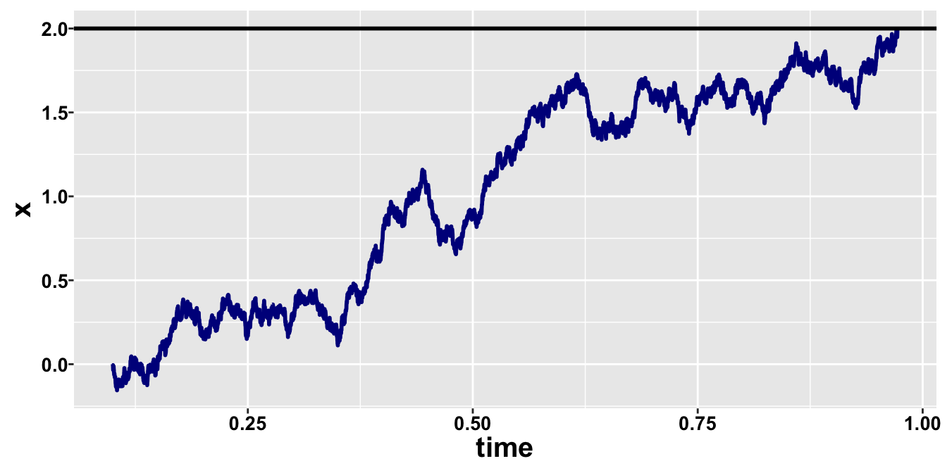 set.seed(11)rdm_path =function(drift, threshold, ndt, sp1=0, noise_constant=1, dt=0.0001, max_rt=2) { max_tsteps = max_rt/dt# initialize the diffusion process tstep =0 x1 =c(sp1*threshold) # vector of accumulated evidence at t=tstep time =c(ndt)# start accumulatingwhile (x1[tstep+1] < threshold & tstep < max_tsteps) { x1 =c(x1, x1[tstep+1] +rnorm(mean=drift*dt, sd=noise_constant*sqrt(dt), n=1)) time =c(time, dt*tstep + ndt) tstep = tstep +1 }return (data.frame(time=time, x=x1, accumulator=rep(1, length(x1))))}drift =1;threshold =2; ndt = .1sim_path =rdm_path(drift = drift,threshold = threshold, ndt = .1)ggplot(data = sim_path, aes(x = time, y = x))+geom_line(size =1, color ="blue4") +geom_hline(yintercept=threshold, size=1)